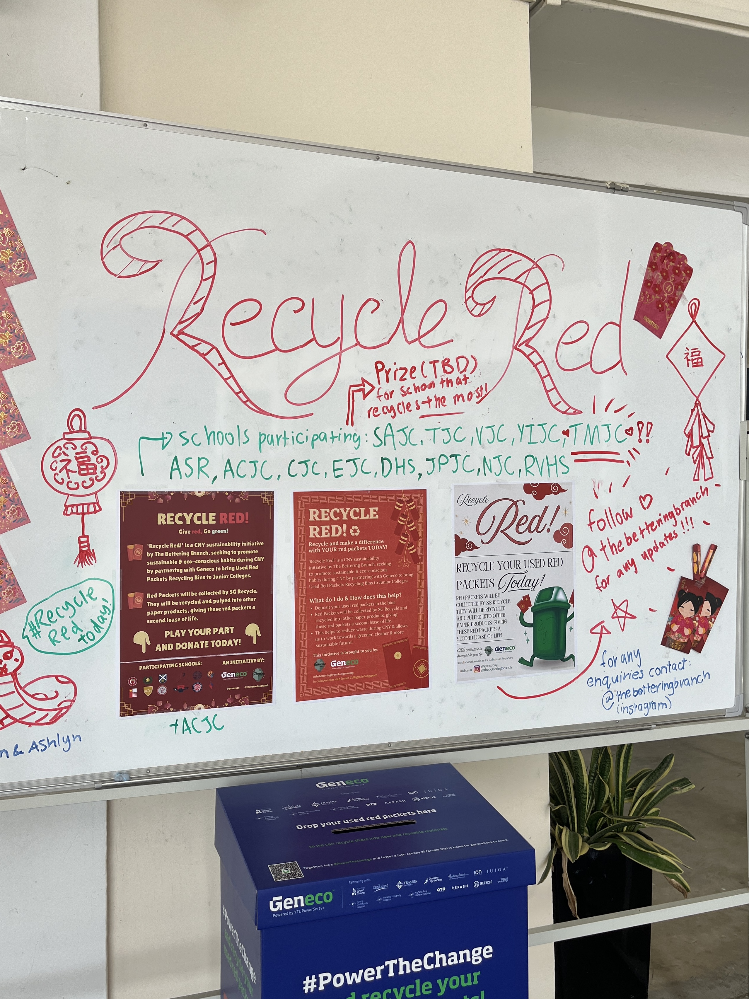 In 2025, We reached out to Geneco and started Recycle Red!, a Chinese New Year sustainability initiative which seeks to promote sustainable & eco-conscious habits during Chinese New Year by partnering with Geneco SG to bring Red Packet Recycling bins to Schools. Recycle Red! is also an inter-school competition, to motivate & reward youths that choose sustainability.